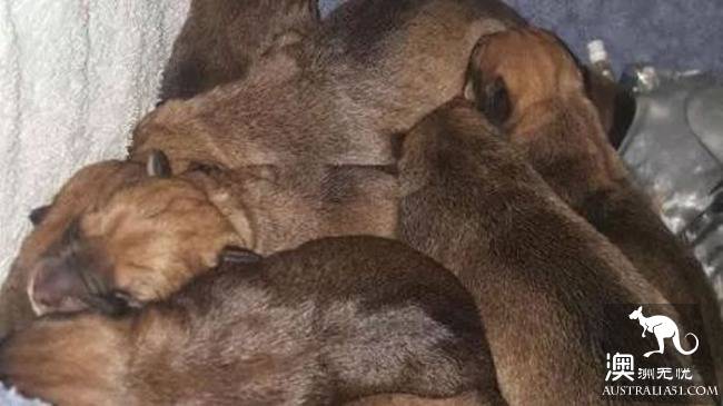 A spokesman for animal protection group RSPCA said nine black and brown puppies were found in the box, but one of them died on his way to a local veterinary clinic.