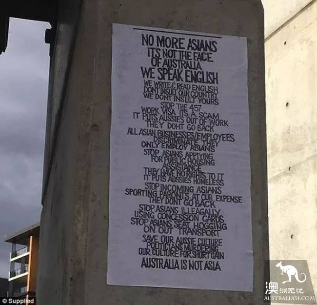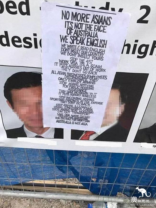 Recently, a species poster was found at Sydney's Top Ryde Mall. Photos taken on the scene show that the poster says, "Asians don't come. Australians don't look like that. We speak English!"