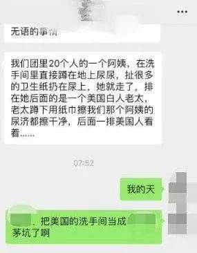 A tour guide in the United States told Miss Z that a Chinese mother squatted directly in the bathroom to urinate on the ground and threw a lot of toilet paper on the urine. After her urination, the white American old woman who was in the back of him, was respected to wipe the urine stains of the Chinese mother.