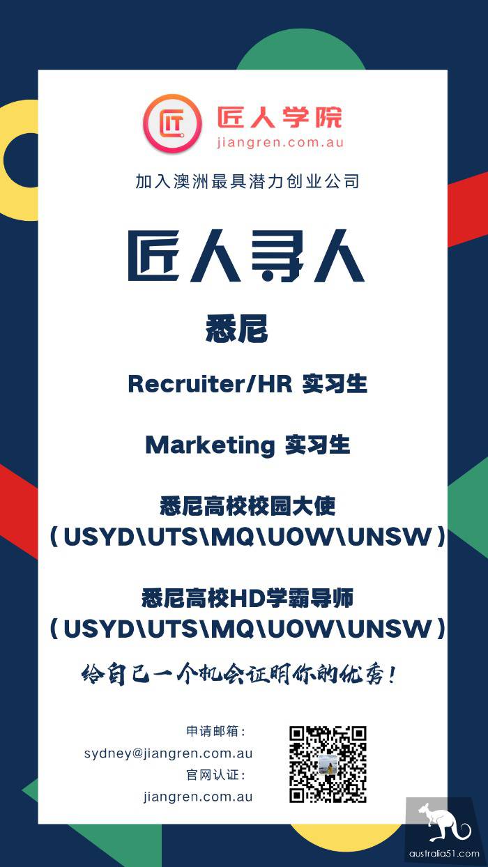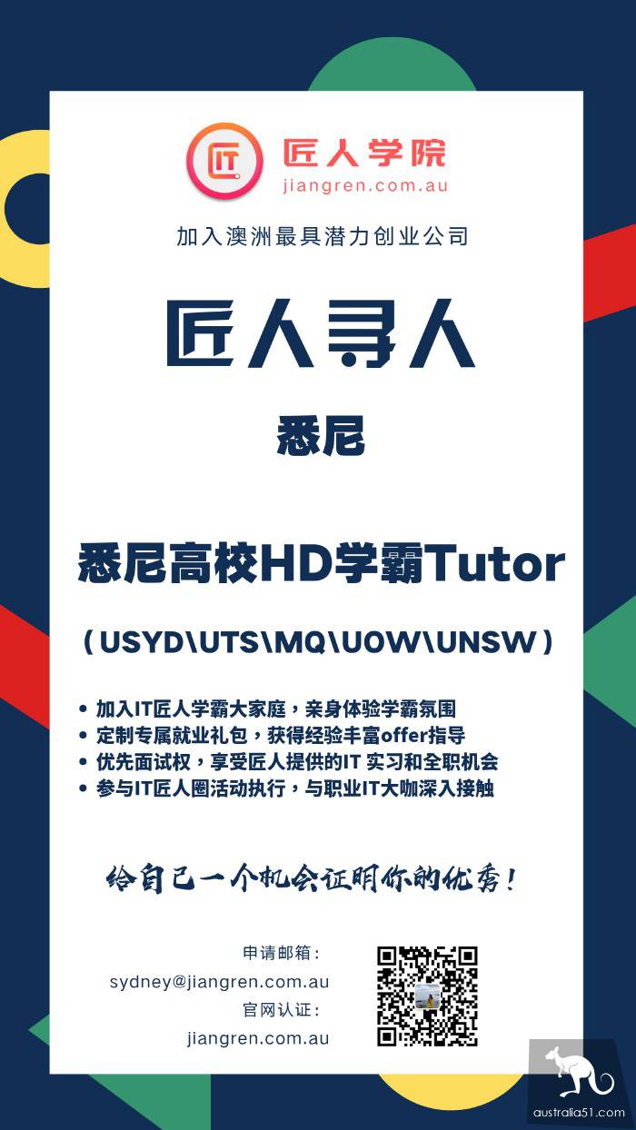 Our vision for all IT Chinese to come to work is no longer a difficult task. It's more than 8,000 IT small partners to focus on joining us and become the largest Chinese IT organization in Australia. It's also approved by thousands of small IT partners. The top-of-the-world IT bull is here, so we're in a foreign country, and it's also felt that the warm community covers the IT job-hunting group, Sydney, Brisbane, Melbourne's local group, the big front-end, php, AI, block chain, Java, Mobile, Laraval, and so on. The activity of tens of thousands of people per day has also proved that our IT people are a group of warm, ideal, and loving groups. Introduction 1. University of Sydney, Tutor[University of Sydney, University of IT, IT Professional HD, Tutor Recruitment] (USYD/ UNSW/ UTS/ MQ/ UOW) Job Content:1. The students who need to be trained according to the requirements and needs of the students. Statistics tutorial 3. To cooperate with the company's tutoring business to carry out the position requirements:1. The coaching experience takes precedence. HD performance is a priority. Flexible application materials for schedule:1. Resume 2. Transcript 3. Indicate two of the subjects you're good at. The craftsman's campus ambassador[Ambassador of the campus of the major universities in Sydney] (USYD/ UNSW/ UTS/ MQ/ UOW). Get an internship and a full-time opportunity to take a free part in all of the public lessons of the IT ingenuity circle. The excellent campus ambassador can be exempted from becoming a full-time employee. The industry has a face-to-face and free-to-face statement. It is a good player, can sign a cooperation agreement with the IT craftsman, and get the exclusive custom-made gift package of the rich Commission and IT craftsman. It is an annual IT craftsman's campus ambassador's party to exchange with the excellent campus ambassador's resources of the whole-Australia. HR Intern IV. The marketing intern quickly contacts the craftsman. Hey, get more information. Official web authentication: https://jiangren.com.au/city/sydney _ sydney's mailbox mode: [email protected]