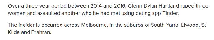 Melbourne-based 44-year-old, Dylan Hartland, is accused of using mobile dating platform Tinder, to locate and rape three women and attack one woman for three years in 2014-16.