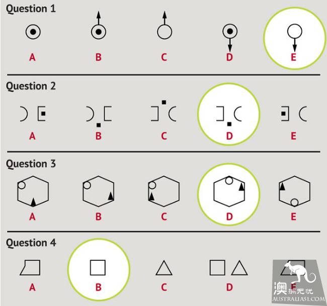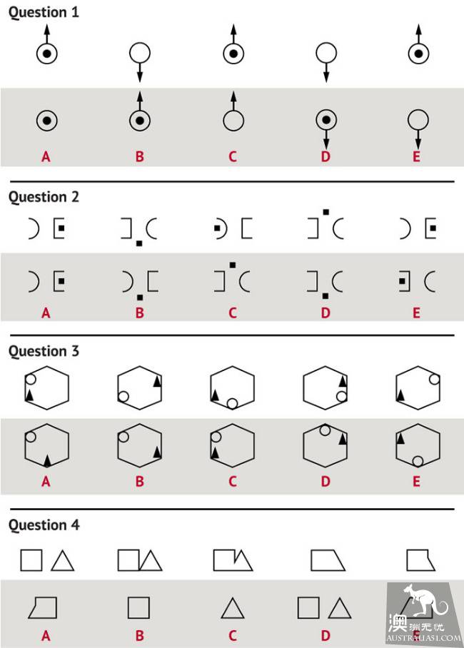 Here are four sample questions in the inductive reasoning section, provided by the testing company SHL. They measure your ability to solve problems and think conceptually and analytically.