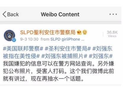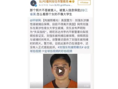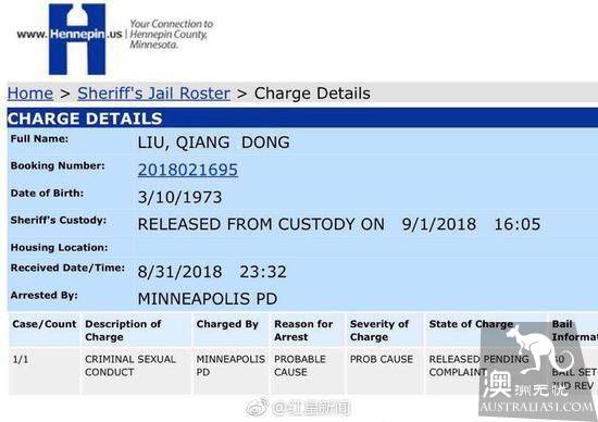 According to a screenshot of the (Hennepin County) Sheriff's website in Henneping County, which is circulating online, the case is also clear. The client suspected of sexual invasion was called Liu Qiangdong, bail gold for 0 yuan. Police spokesman John Elder said Liu Qiangdong's condition is "released pending summons" (Released Pending Complaint).
