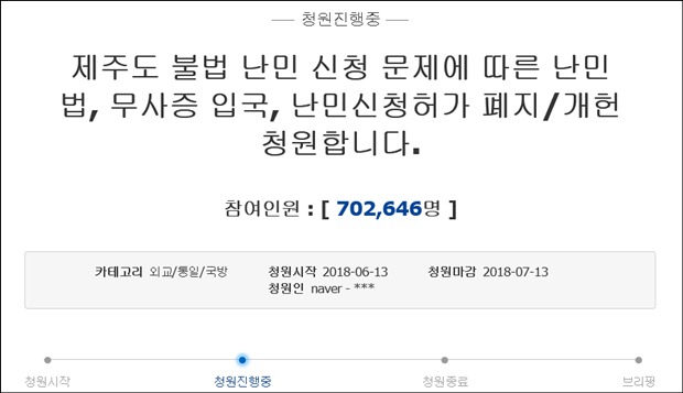 On June 13, South Koreans launched a petition on the official website of Qingwattai to oppose the Refugee Law and Cheju Island visa-free policy. As of July 12, more than seven hundred thousand people had signed joint petitions.