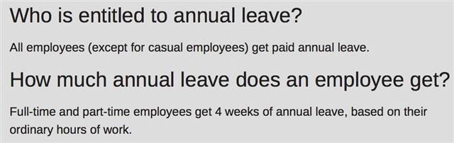 Full-time and part-time employees have four weeks of paid annual leave each year. Temporary employees can claim unpaid annual leave from their employers although they do not have paid leave. There are also many situations where you can take leave, such as sick leave, nursing leave, and baby leave.