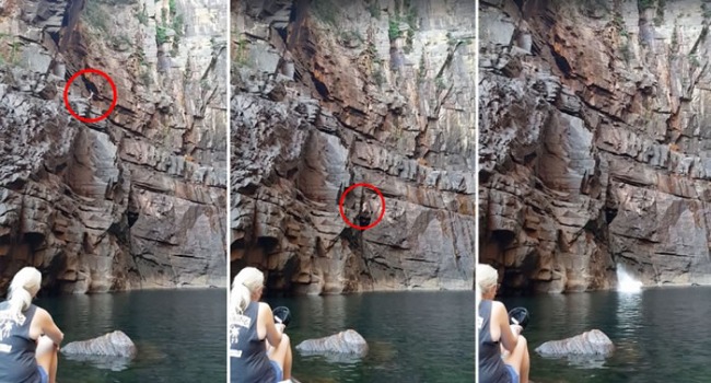 After 10 bottles of beer, Jones climbed to the top of the cliff beside the waterfall and leaped down. The onlookers, unaware of the serious consequences of Jones's move, cheered on the shore.