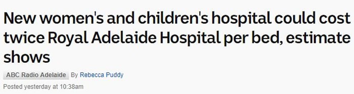 Health minister Stephen Wade said the estimated cost of the building needs to be reestimated because, on average, the hospital costs twice as much per bed as the Royal Adelaide Hospital, which is more expensive than a similar hospital in the state.