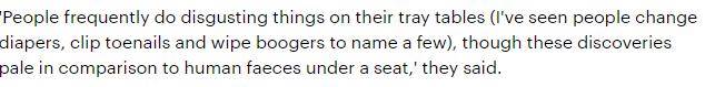 "people often do disgusting things on small tables (I've seen people change diapers, cut toenails and wipe their noses, etc.), but none of these are shocking under their seats," they said.