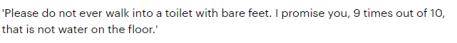 ``Please don't enter the bathroom with bare feet. I promise that 9 times in 10 times is not water. ''