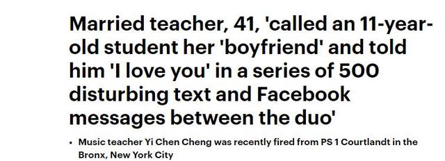 According to the New York Post, Cheng Yicheng, a Chinese music teacher in New York, called him "boyfriend" in a text message sent to an 11-year-old male student, after the Special Commissioner investigated the matter. Cheng Yicheng has recently been dismissed from his school.