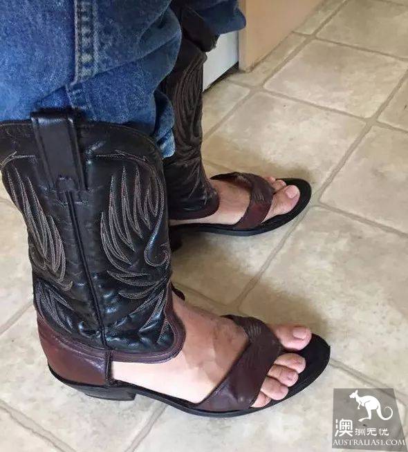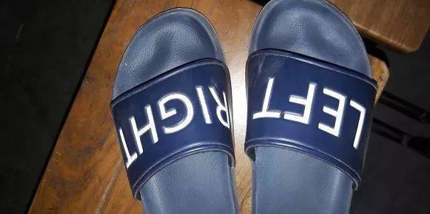 The shoe on the left foot says "right", the shoe on the right foot says "left",