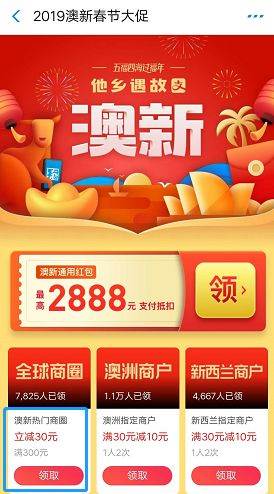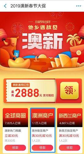 During the Spring Festival in 2019, Alipay will unite with more than 7,000 businesses in Australia and New Zealand to jointly host the "five Fates and four Seas to celebrate the year of Happiness-other's hometown" and promote the Spring Festival.
