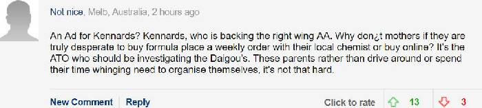 Is this an advertisement for the warehouse? If these mothers really need milk powder so much, why not buy it a week at a time from a local drugstore or online? It is the Australian Inland Revenue Department's business to crack down on purchasing agents. Instead of driving all over the street, think of something else. It's not that hard to buy.