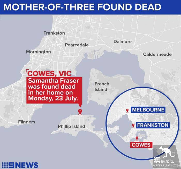 According to 9NEWS, Samantha Fraser was found dead last month at her home in (Phillip Island), Philip Island. Her ex-husband allegedly used a cell phone registered under a fake name, but the phone was found located on Philip Island after Samantha's death.