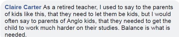 "as a retired teacher, I once told such parents to make their children happy, but I would also tell the parents of white children that they had to make their children study harder. Balance is what we need. "