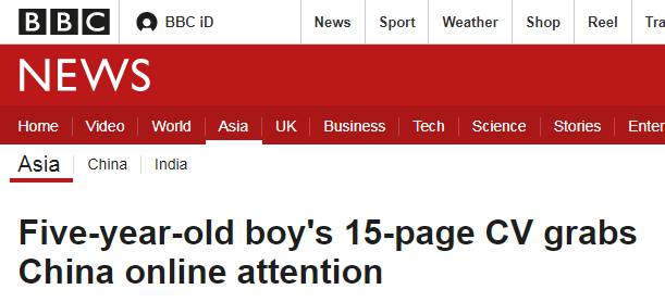 The British Broadcasting Corporation: 5-year-old boy's 15-page resume explodes the Chinese network