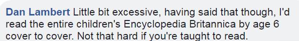 Some people think: "although a little too much, but I have to say, when I was 6 years old, I had read the entire children's edition of the Encyclopedia Britannica. It's not that hard if someone teaches you to read. "