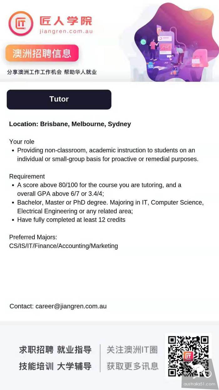 Our vision for all IT Chinese to come to work is no longer a difficult task. It's more than 8,000 IT small partners to focus on joining us and become the largest Chinese IT organization in Australia. It's also approved by thousands of small IT partners. The top-of-the-world IT bull is here, so we're in a foreign country, and it's also felt that the warm community covers the IT job-hunting group, Sydney, Brisbane, Melbourne's local group, the big front-end, php, AI, block chain, Java, Mobile, Laraval, and so on. The activity of tens of thousands of people per day has also proved that our IT people are a group of warm, ideal, and loving groups. Job introduction to the work of the University of Sydney, Tutor[University of Sydney, the major IT major in the major university of IT] (USYD/ UNSW/ UTS/ MQ/ UOW):1. The students who need to be trained according to the requirements and needs of the students. Statistics tutorial 3. To cooperate with the company's tutoring business to carry out the position requirements:1. The coaching experience takes precedence. HD performance is a priority. Flexible application materials for schedule:1. Resume 2. Transcript 3. Note the accounts you are good at, contact the craftsman, get more information, official network authentication: https://jiangren.com.au/city/sydney social app contact: sydneyjiangren's mailbox mode: [email protected]