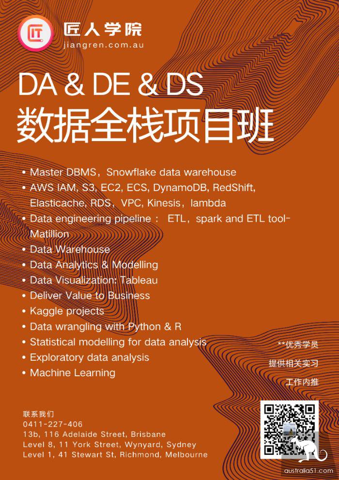 Our vision makes it no longer difficult for all IT Chinese to find a job. More than 8000 IT partners have joined us and become Australia's largest Chinese IT organization. It is also recognized by thousands of IT partners. From the world's top IT cattle gathered here, let us in foreign countries, but also feel that the warm community covers the IT job search group, Sydney, Brisbane, Melbourne local group, large front-end, php, AI, block chain, Java, Mobile, Laraval and other professional and technical groups. The activity of tens of thousands of people every day also proves that we IT people are a group of enthusiastic, ideal and more loving groups. Data stack project class from introduction to entry four project data stack career coaching support: face-to-face remote BI Developer Data Analyst ETL Developer Database Developer Junior Data Engineer Associate Data Scientist through the introduction of data engineering, data analysis and data science to lead students to understand the data of the industry background, career prospects and career development direction of in-depth understanding of DA, DE& DS flexible learning and actual combat, Get case experience and teamwork experience Saturday can also participate in free auditions Oh! Contact Sydney craftsman Xiao Hey, get course information ha official website certification: https://jiangren.com.au/city/sydney social app contact: tech_sydney email: [email protected]