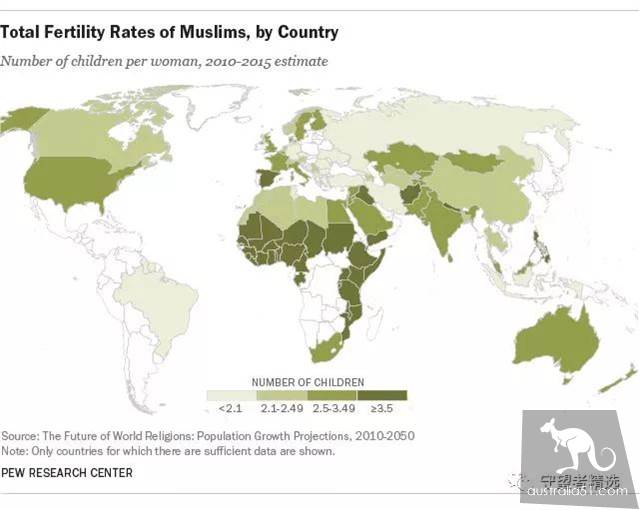 The global Muslim fertility map provided by the U.S. authority statistics agency Pew, with a dark color of high fertility
